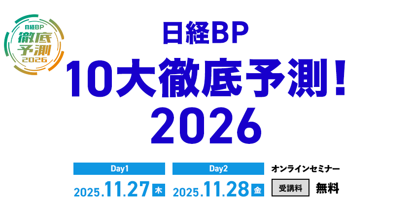 「日経BP 10大徹底予測!2026」特別シンポジウムでは、日経ビジネス、日経クロステック、日経クロストレンド、日経クロスウーマンなどを中心に40を超える専門メディア、400人の専門記者・編集者・研究員の集合体である日経BPの総力を挙げ、2026年の世界と日本はこうなる、と断言する「日経BP10大予測」を発表します。