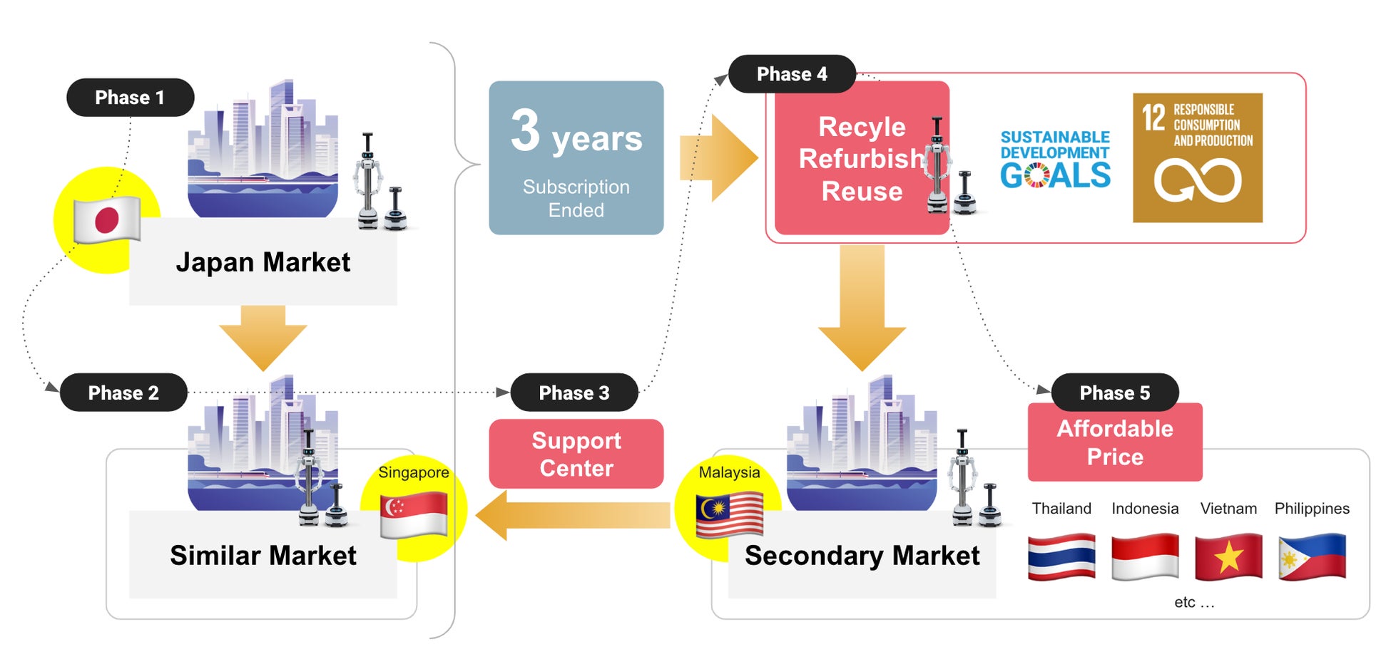 ugoは、本事業において、シンガポール・マレーシアをターゲットに、日本のAIロボット技術を活用したサービスロボット市場を確立し、アジア全域への展開を通して、ロボット活用先進国である日本主導によるロボット活用の普及、および日本国内での AI 高度化や新規開発への投資促進による国内雇用や産業波及効果の拡大を目的とした、現状分析と現地調査を実施します。そして、日本やシンガポール等のプライマリー市場からロボット機体を整備し、マレーシア等のセカンダリー市場に流通できるようなスキームを検討し整理することで循環型ビジネスエコシステムの確立を狙います。